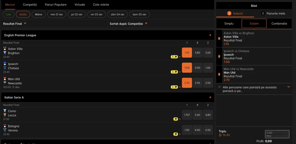 Puteți pune împreună un expres de două sau mai multe evenimente pentru a vă maximiza profitul prin multiplicarea cotelor. Sistemul va calcula automat câștigurile potențiale și va arăta în mod clar cum diferă cotațiile de pariurile simple.