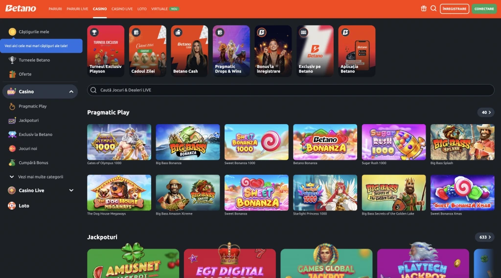 Principalul avantaj al cazinoului online Betano este colecția sa impresionantă de jocuri. Platforma oferă peste 3.000 de sloturi diferite și jocuri cu dealer live. Utilizatorii pot sorta jocurile după categorie, furnizor sau temă, precum și să folosească bara de căutare. În majoritatea cazurilor, pariul minim este de 0,1 lei, dar sloturile individuale pot fi pariate până la 1000$ pe rotire.