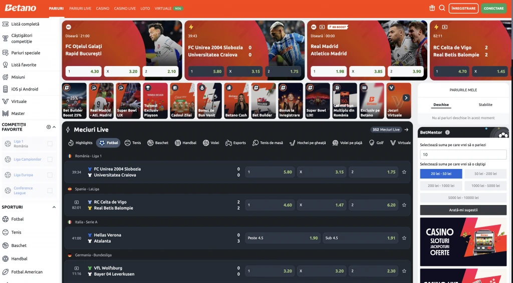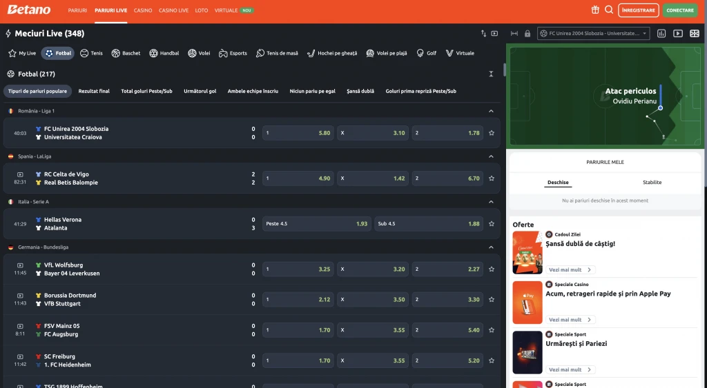 Secțiunea LIVE a Betano acoperă sute de evenimente. Casa de pariuri adaugă meciuri pentru pariuri live cu 5-10 minute înainte de începerea jocului. În timp real, posibilitatea de decontare anticipată a pariurilor este disponibilă atunci când se ajunge la un anumit rezultat. De asemenea, LIVE oferă adesea un lineup extins, inclusiv pariuri pe intervale orare.