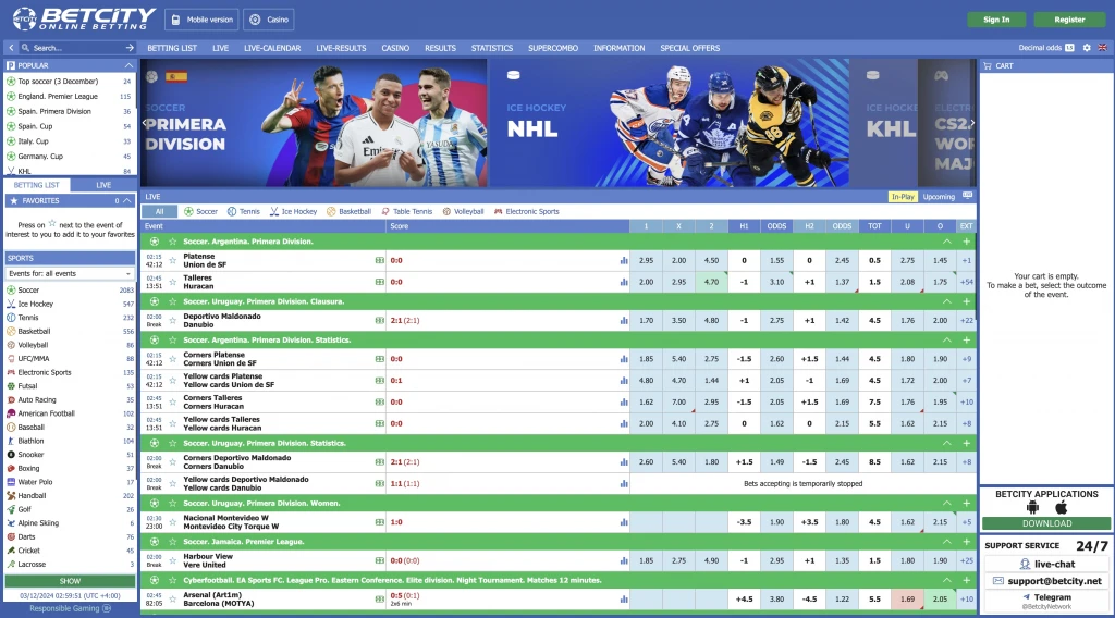 Opțiunile de pariere la Betcity includ piețe principale și secundare, intervale temporale, curse până la N goluri, piețe asiatice, rezultate combinate și statistici.