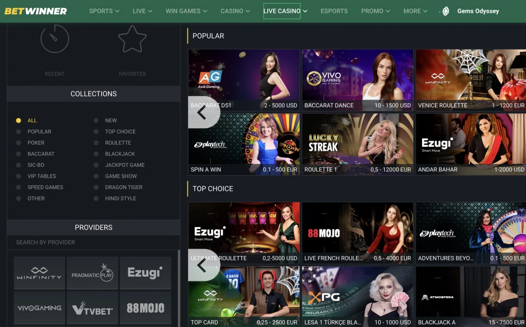 În cazinoul live puteți juca jocuri de masă și de cărți cu dealeri - ruletă, poker, baccarat, blackjack, monopoly, Dragon Tiger, Sic Bo și alte jocuri de divertisment.