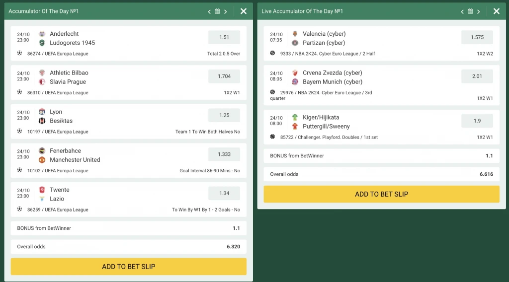 Linia Betwinner oferă expresii gata făcute cu cote mărite cu 10%.