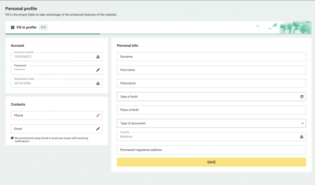 Pentru înregistrare, casa de pariuri Betwinner nu solicită un pașaport de la client. Trebuie să vă confirmați identitatea atunci când primiți o solicitare din partea companiei. În cabinetul personal, jucătorii încarcă copii scanate ale pașaportului lor și completează un chestionar cu datele pașaportului.