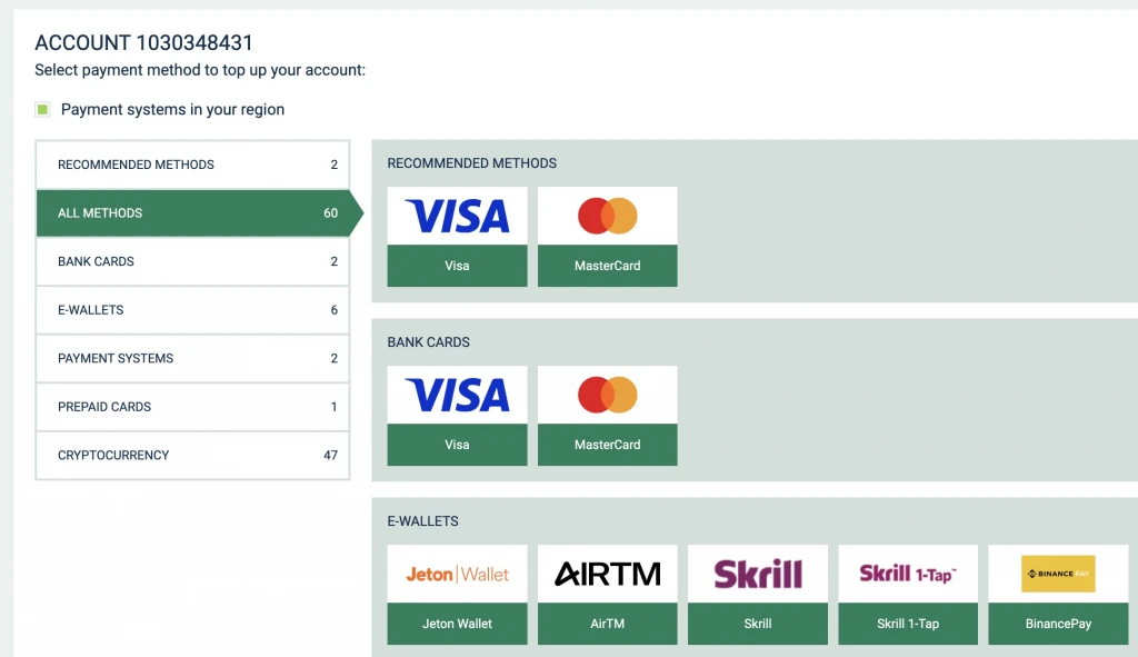 Metodele de depunere și plată depind de țara utilizatorului și de moneda contului.
