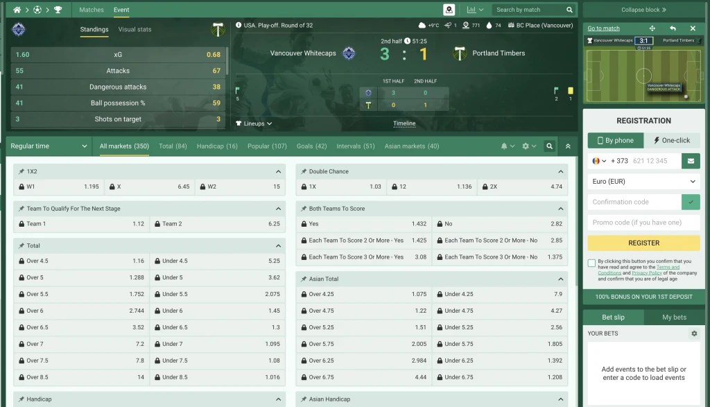 Casa de pariuri acceptă pariuri pe statisticile din turul competițiilor importante și acceptă pariuri speciale pe situații de joc în meciuri de fotbal populare, de exemplu, pe un gol cu capul și din afara suprafeței de pedeapsă sau pe victoria unei echipe și o remiză zero la zero după prima repriză.