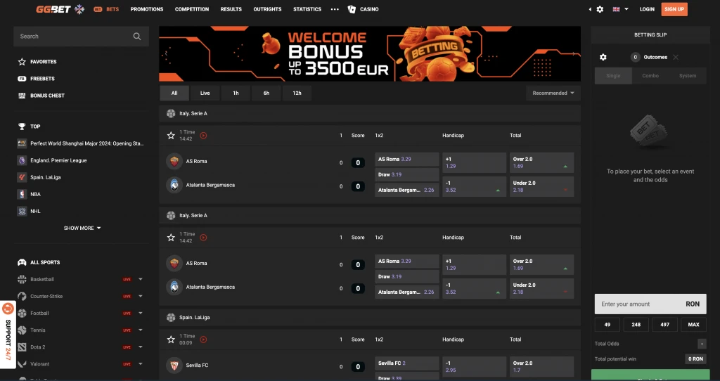 Catalogul disciplinelor sportive este fixat în bara laterală stângă. Tot aici există filtre de sortare a meciurilor, o secțiune cu favorite și o listă de evenimente recomandate.