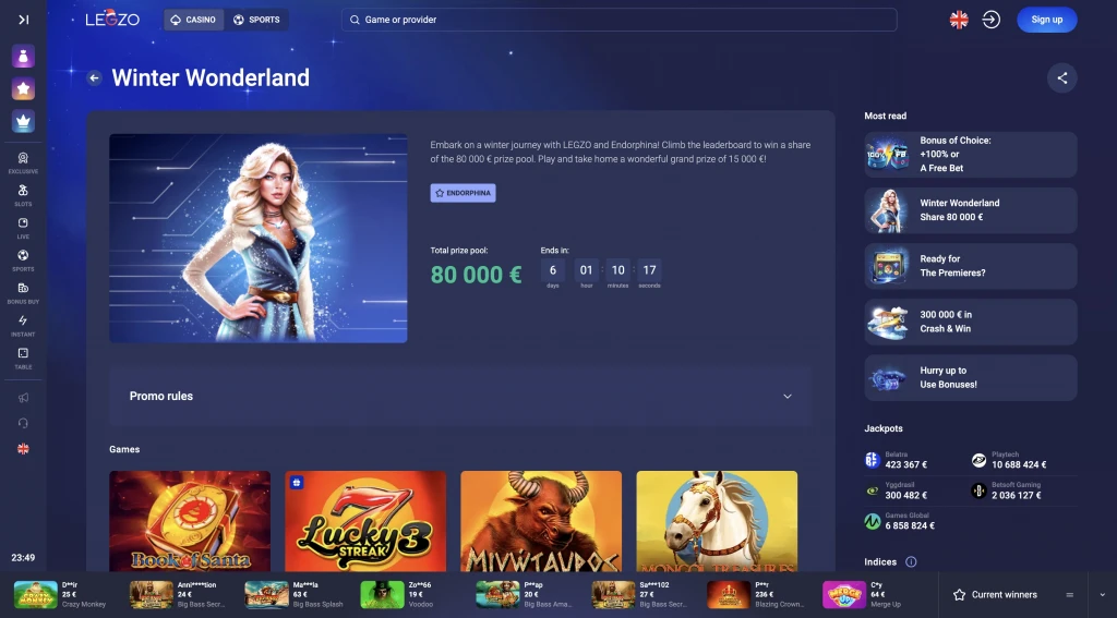 Legzo combină serviciile unui magazin de pariuri și ale unui cazinou online. Site-ul are 5 secțiuni cu divertisment de jocuri de noroc.