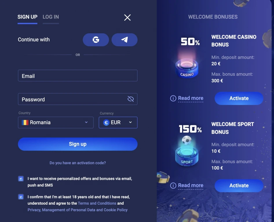 În timpul înregistrării, casa de pariuri oferă să introduceți un cod promoțional funcțional și să vă abonați la alerte bonus și oferte promoționale personalizate.