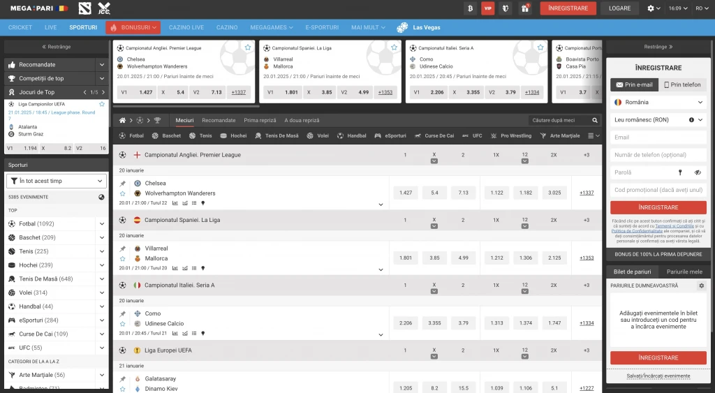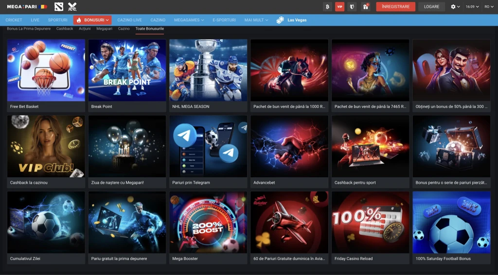 Agenția de pariuri furnizează cote avantajoase pentru competiții sportive și de e-sports. Marja operatorului Megapari pentru pariuri pe turnee majore la fotbal, tenis și baschet variază între 3-5%.
