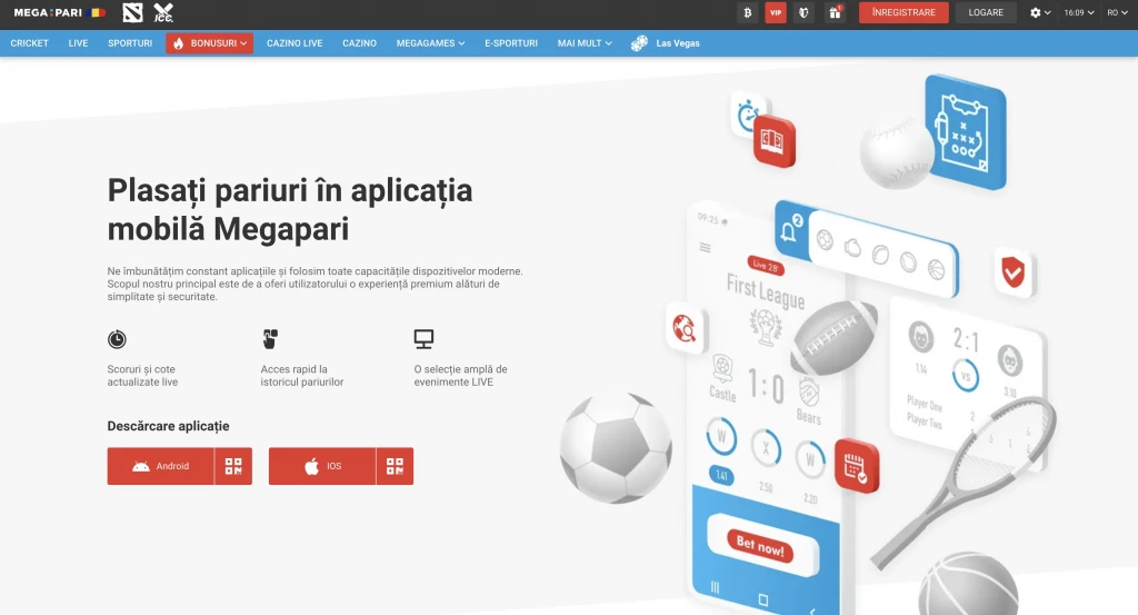 Operatorul de pariuri Megapari își furnizează serviciile pe platforma oficială în domeniul .com și prin aplicația mobilă pentru iOS și Android.