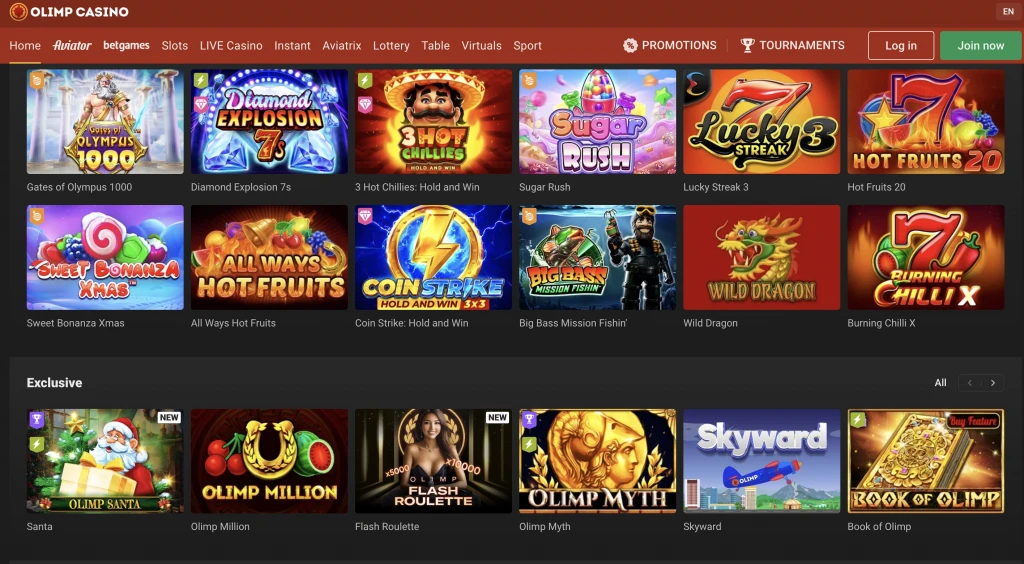 Pe site-ul oficial Olimp există un cazinou online. Pentru a ajunge la sala de jocuri, trebuie să deschideți secțiunea corespunzătoare în bara de meniu de sus. Compania a lansat o mulțime de sloturi, împărțite în mai multe categorii. În plus față de mașinile clasice de construcție, există simulatoare de jocuri de masă și mese cu crupieri live. Toate sloturile sunt disponibile în modul demo. Live Casino acceptă doar bani reali.
