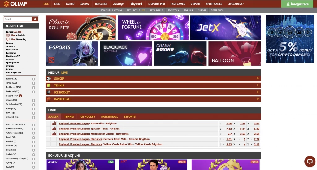Offshore Olimp acceptă doar pariuri online. În mod implicit, site-ul se deschide în limba engleză, dar conținutul este tradus în alte 13 limbi — inclusiv versiunea în limba română. Designul resursei este dominat de culorile roșii. Structura meniului este simplă și clară. Pe panoul de sus al paginii de start veți găsi următoarele secțiuni: