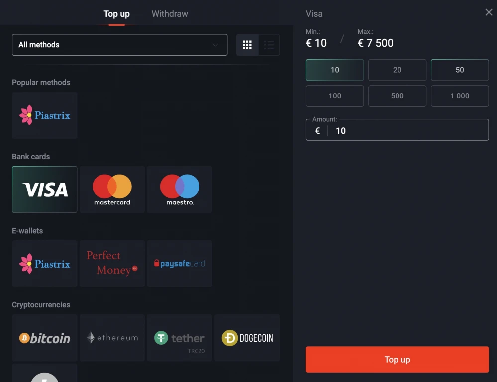 Puteți deschide un cont la Pin Up în 8 valute, inclusiv Euro. Metodele de depunere și retragere depind de moneda selectată. Nu există comisioane pentru operațiunile de plată în biroul casei de pariuri.