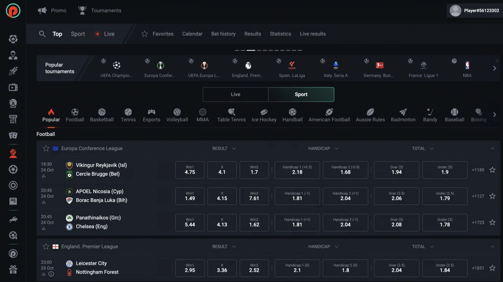 Pe pagina principală, utilizatorii vor vedea linia pentru evenimente populare în prematch și live, tipuri de sporturi, cupon, bara de căutare și butoane pentru a merge la categoriile de jocuri.