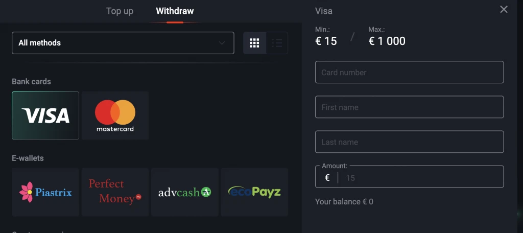 Limita minimă de retragere la carduri - 7-15 euro, în funcție de metoda de transfer aleasă.