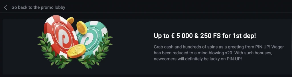 Pin Up oferă jucătorilor noi un bonus de 100 până la 125% din primul depozit până la €5000. Procentul recompensei de bun venit depinde de mărimea depozitului.