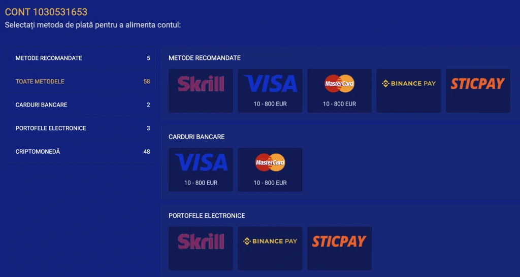 Suma minimă de depunere este de 10 euro. Banii sunt primiți instantaneu și fără comision. Limita inferioară pentru retragerea câștigurilor este de 10 euro. Operațiunea durează aproximativ 15 minute.