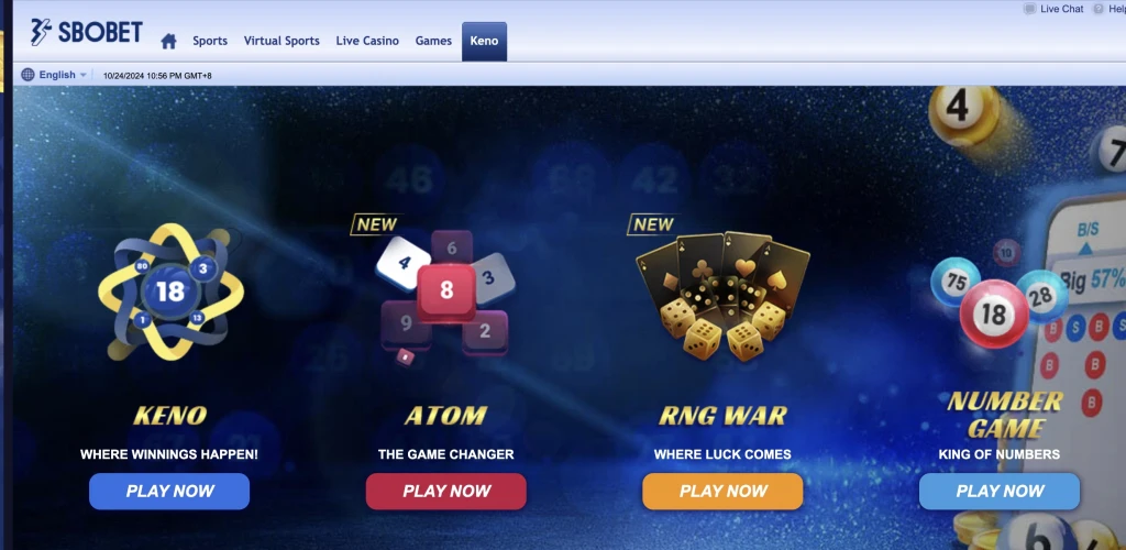 Sbobet nu oferă Bingo, dar există un analog direct al acestui joc numit Keno - o loterie numerică în care jucătorul trebuie să marcheze oricare douăzeci de numere de la 1 la 80 pe o foaie specială.