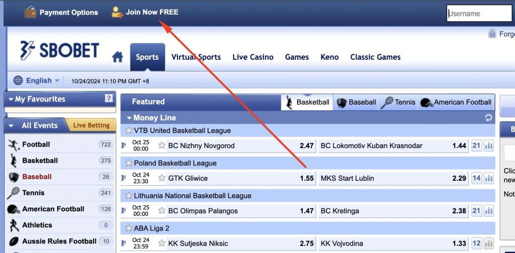 Crearea unui cont la casa de pariuri Sbobet se face în doi pași. În primul rând, accesați site-ul oficiului și faceți clic pe Join Now for Free în meniul de sus al ecranului.