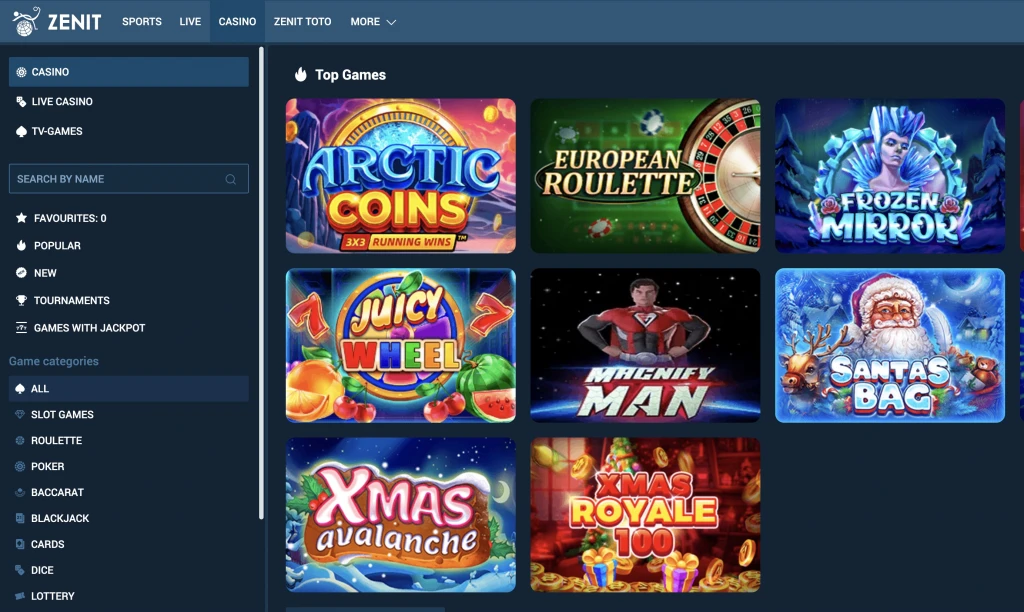 Zenitbet a integrat în cazinou sloturi de la furnizori de top precum Playson și Betsoft. Utilizatorii platformei pot lansa sloturi tematice, jocuri de cărți și își pot încerca norocul la loto.