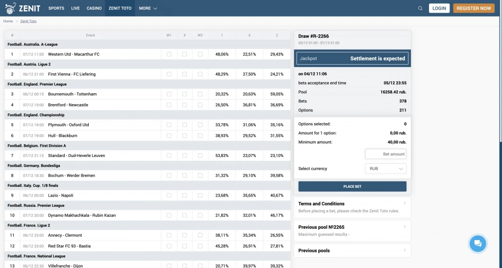 Biroul casei de pariuri Zenitbet organizează un totalizator sportiv. Compania publică informații despre tragerea la sorți curentă în secțiunea Zenit Toto. Superexpress constă în 15 evenimente, iar jackpot-ul ajunge la 160000 de euro.